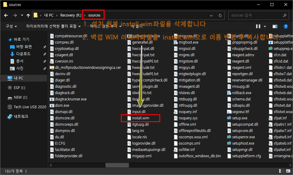 OEM 원본이미지 또는 사용자 백업 WIM 이미지를 install.wim으로 이름 변경 후 교체합니다.