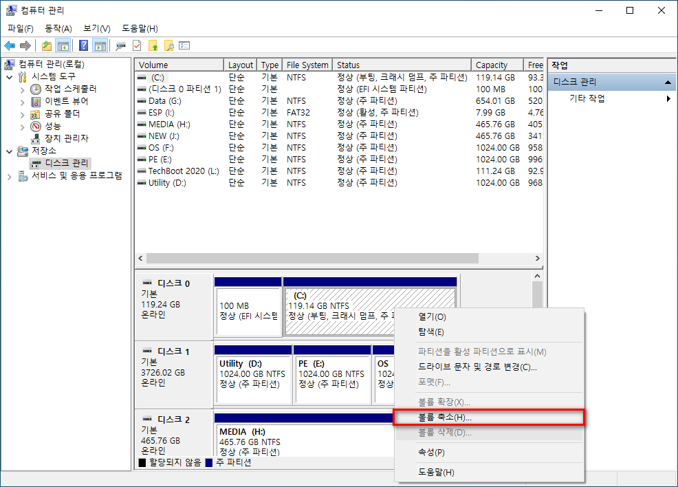 2-1 내 컴퓨터 우클릭 - 관리 - 디스크 관리 - C: 드라이브 우클릭 - 볼륨 축소 - 축소할 공간 입력(MB)