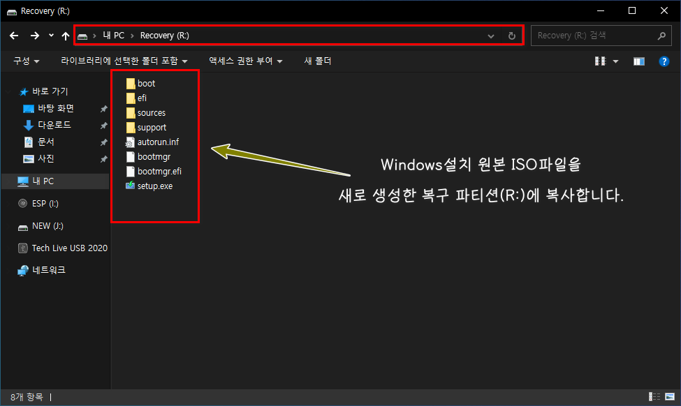 2-2 Windows설치 원본 ISO파일을 마운트 한 후 드라이브의 내용을 새로 생성한 복구 파티션(R:)에 복사합니다.