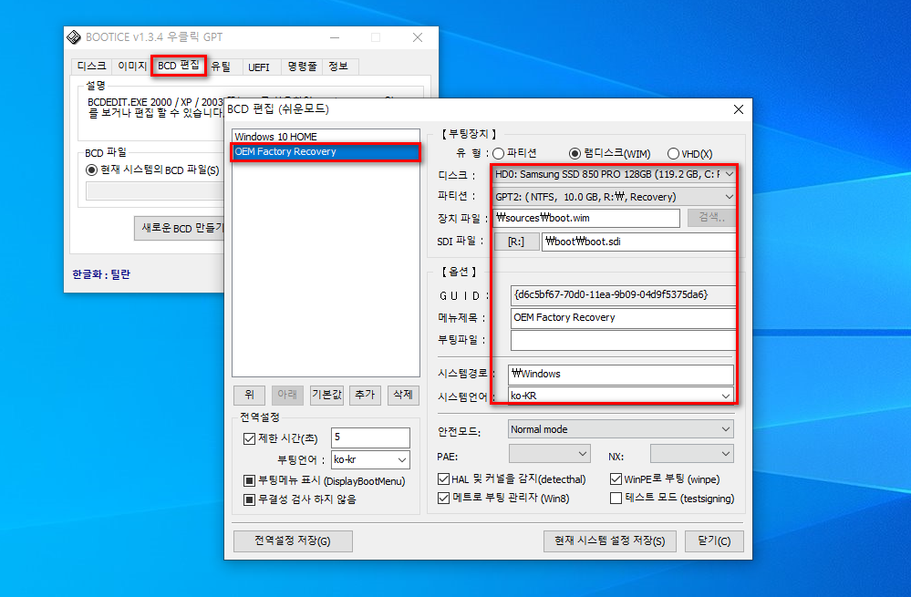 공장 복구 파티션 생성 및 부팅 메뉴 자동 등록