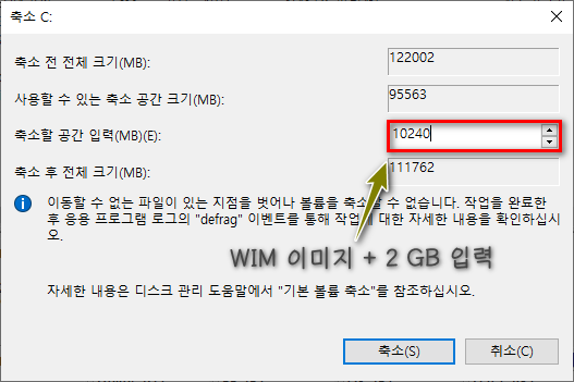 (예: 파티션 크기는 OEM 원본 이미지 또는 사용자 백업 WIM 이미지 + 2 GB,)